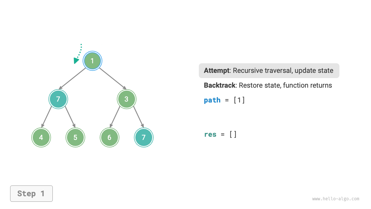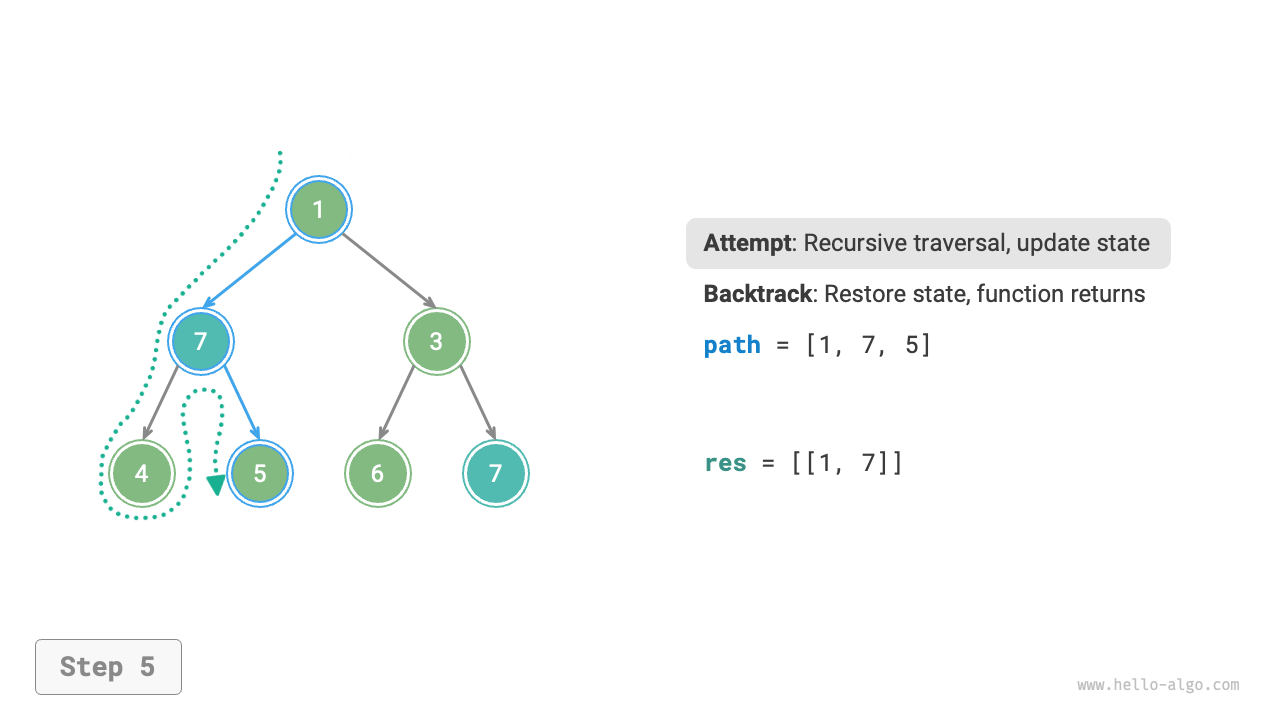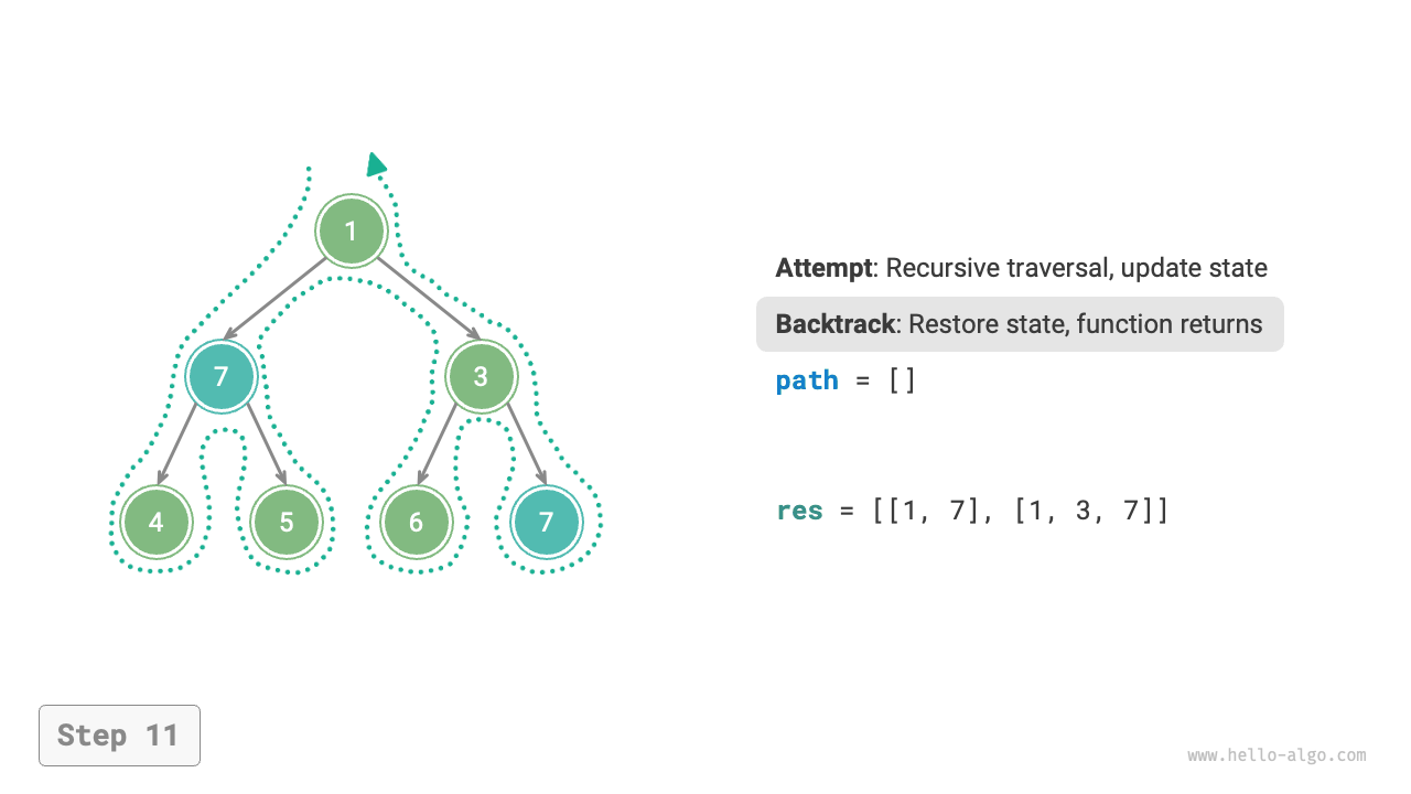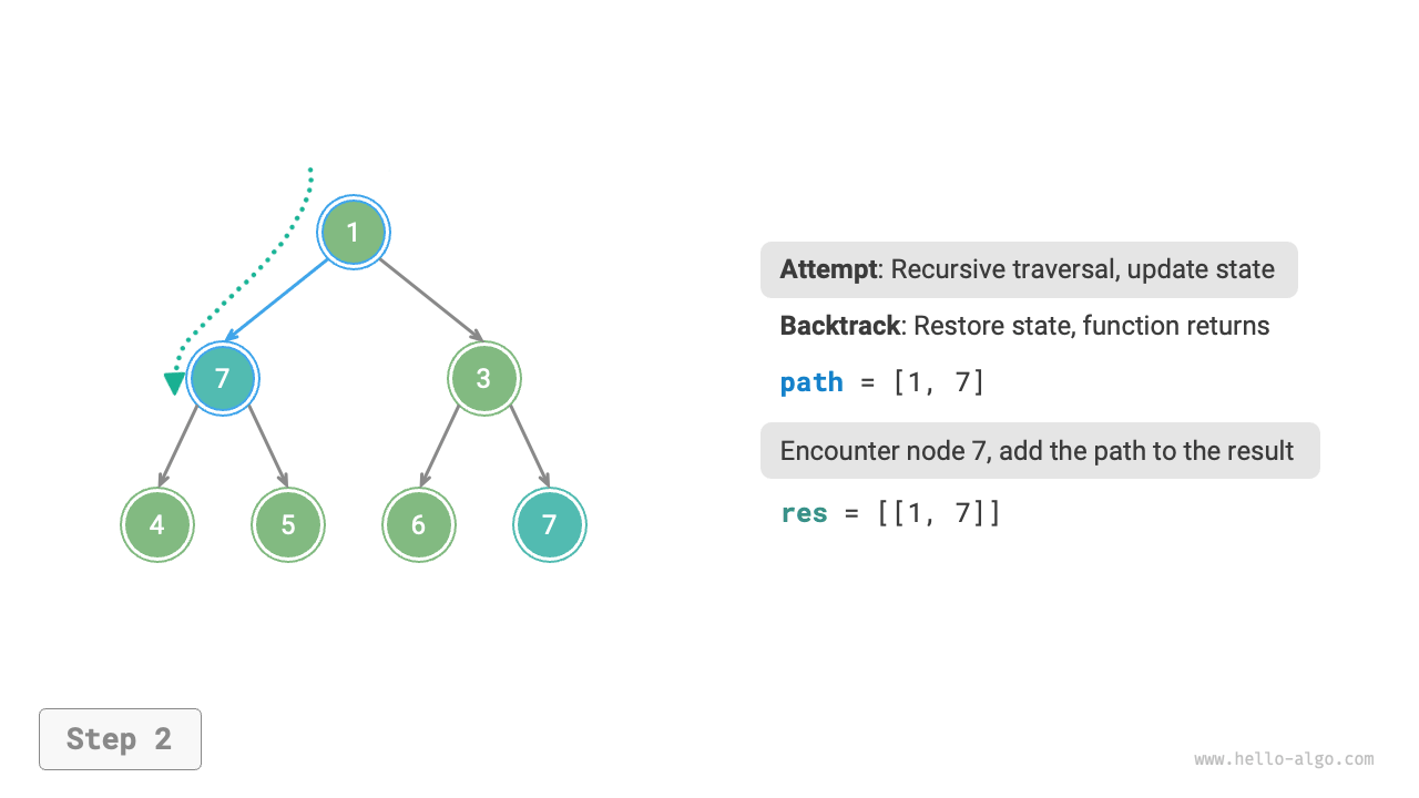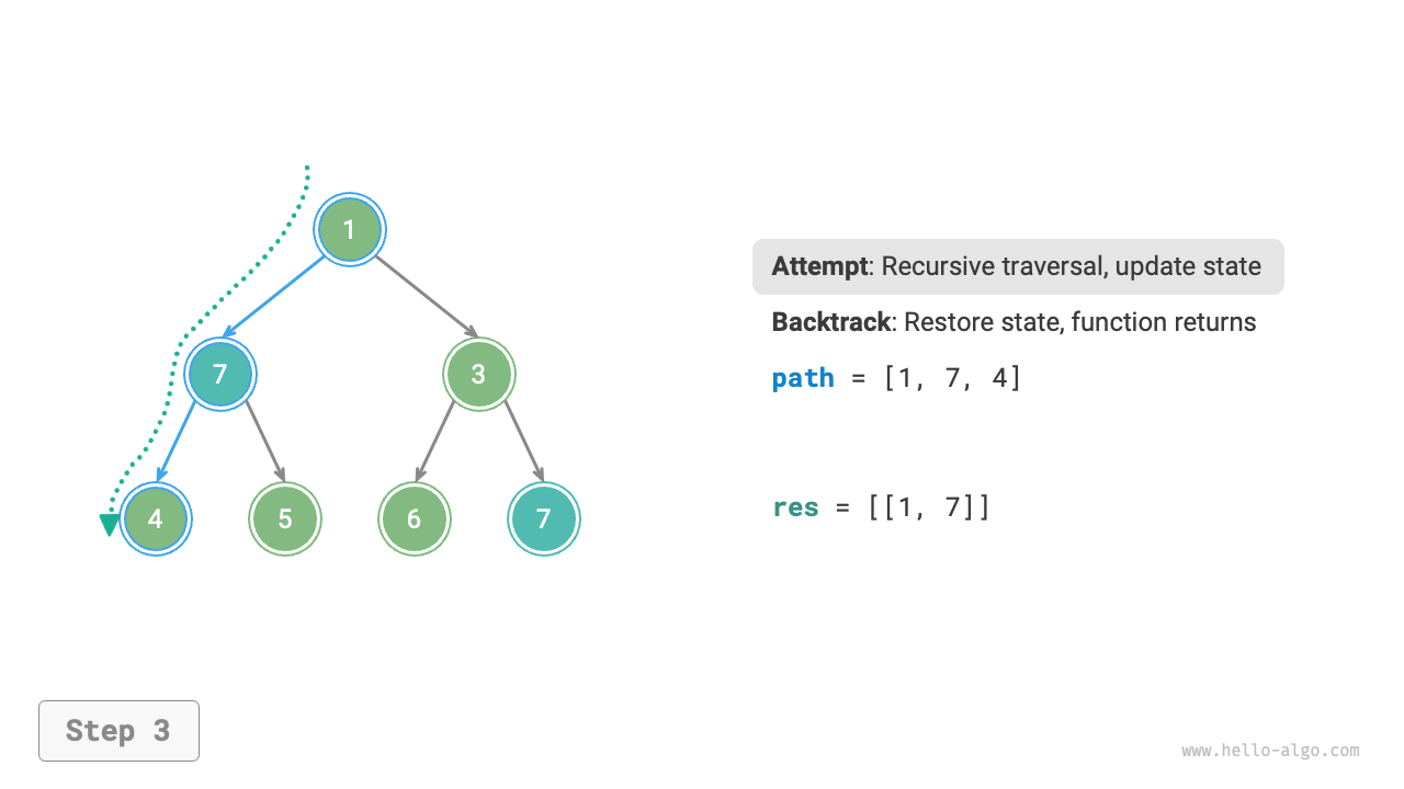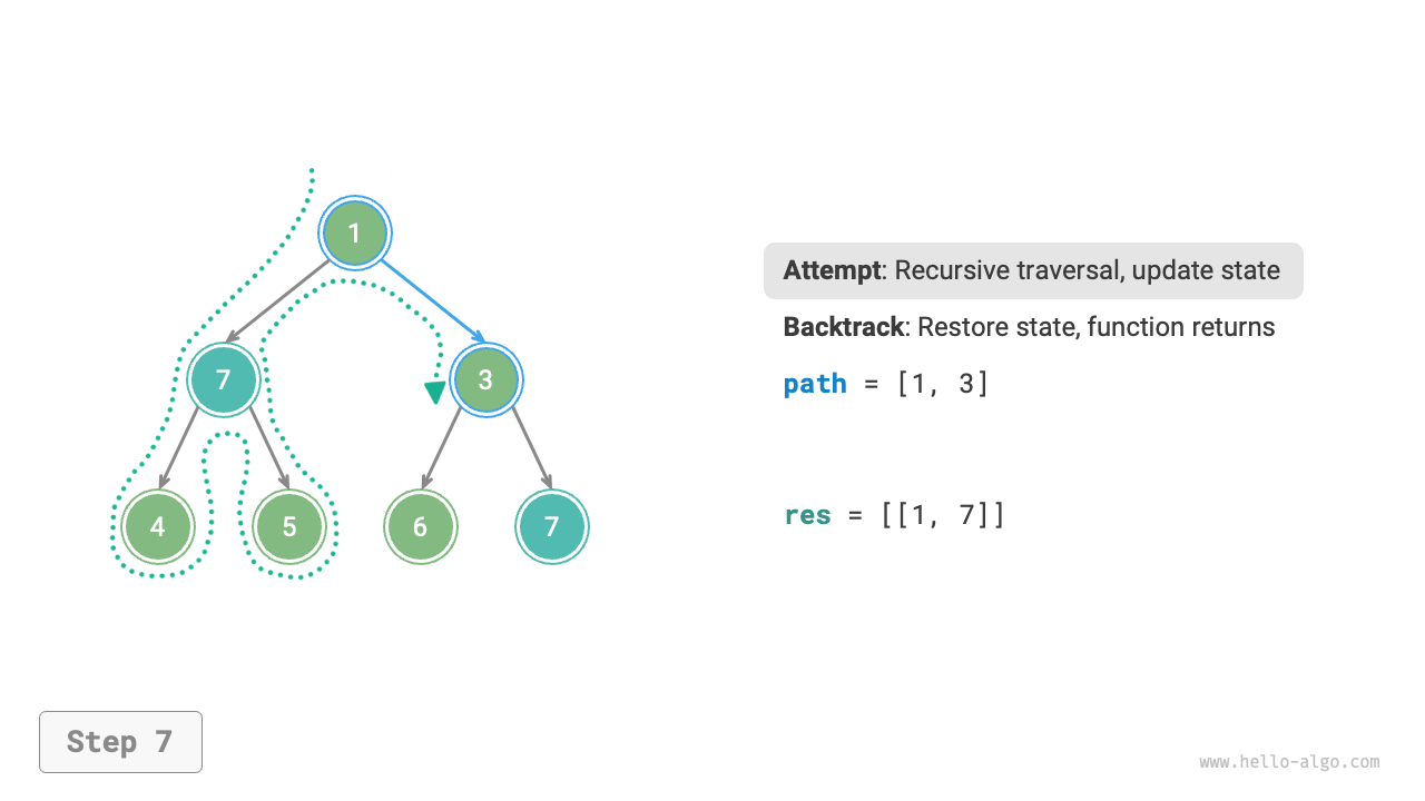 | 試行(attempt) | 試行は、利用可能な選択肢に基づいて解空間を探索する過程であり、選択を行い、状態を更新し、解かどうかを確認する | 左(右)子ノードを再帰的に訪問し、ノードを path に追加し、ノードの値が \(7\) かを確認する |