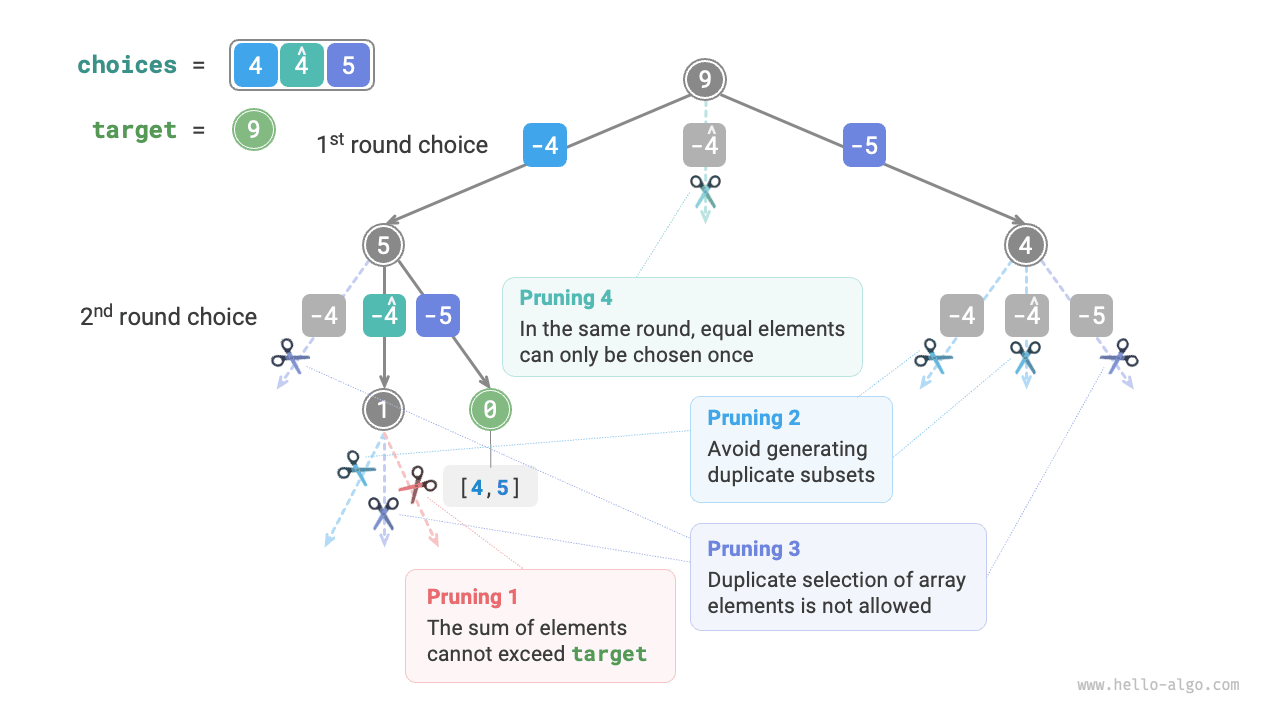 以下の図は、配列 \([4, 4, 5]\) とターゲット要素 \(9\) のバックトラッキングプロセスを示し、4種類の剪定操作が含まれています。図とコードのコメントを組み合わせて、検索プロセス全体と各種類の剪定操作の動作を理解してください。