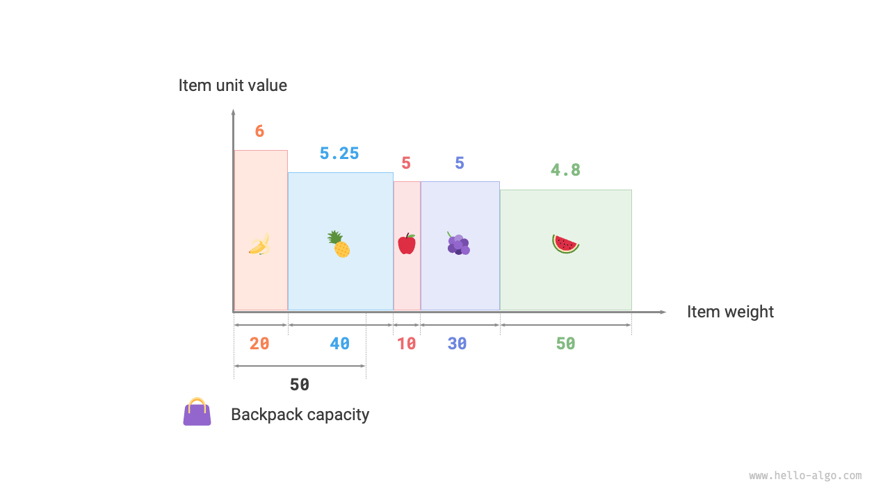 ナップサック内のアイテムの総値を最大化することは、本質的に単位重量あたりの値を最大化することを意味します。これから、下の図に示す貪欲戦略を導出できます。