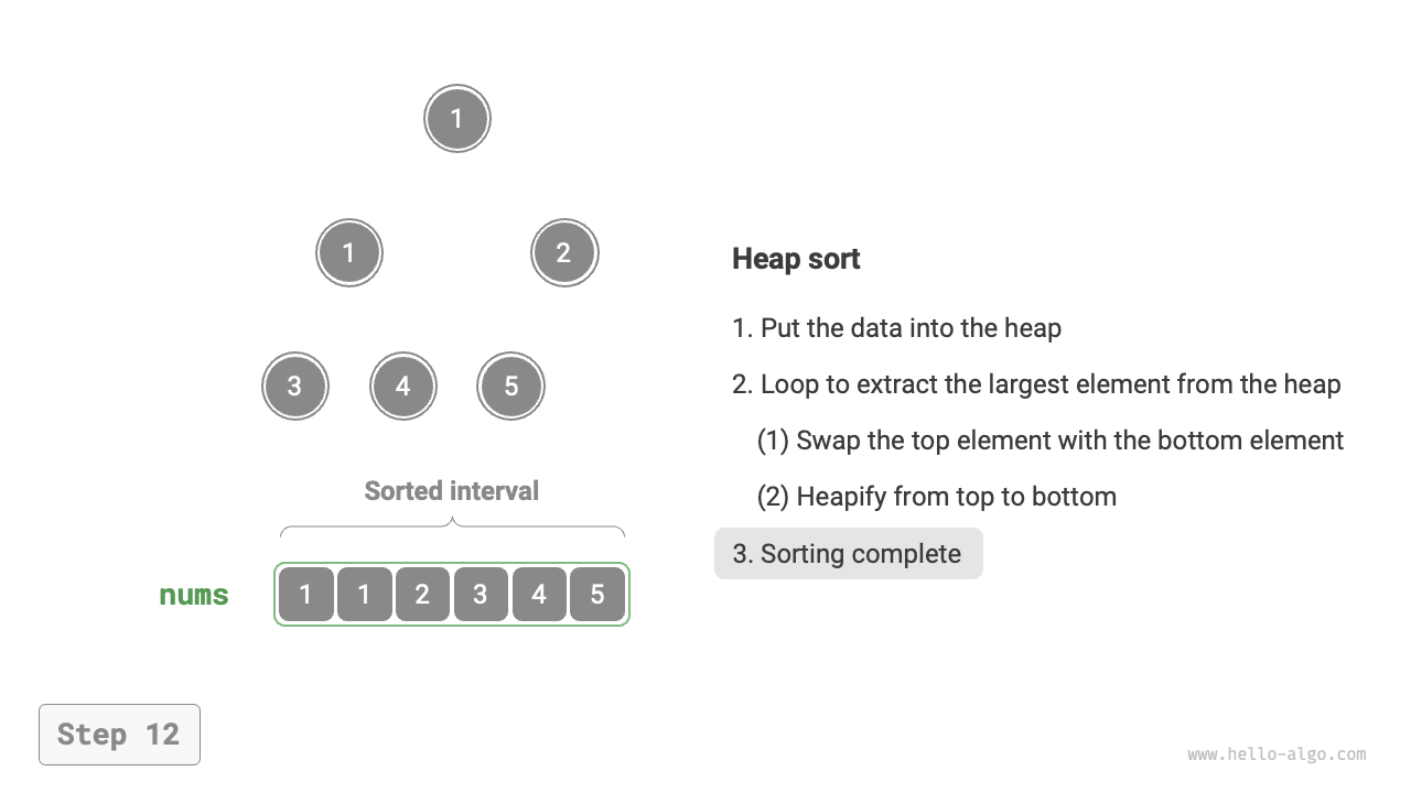 - 時間計算量は \(O(n \log n)\)、非適応ソート:ヒープの構築は \(O(n)\) 時間を使用します。ヒープから最大要素を抽出するには \(O(\log n)\) 時間がかかり、\(n - 1\) ラウンドループします。