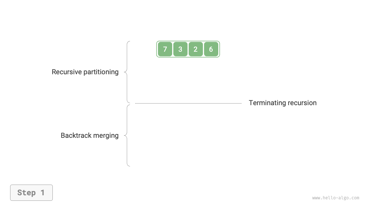 midを計算し、左サブ配列(区間[left, mid])と右サブ配列(区間[mid + 1, right])を再帰的に分割します。 - サブ配列の長さが1になるまでステップ