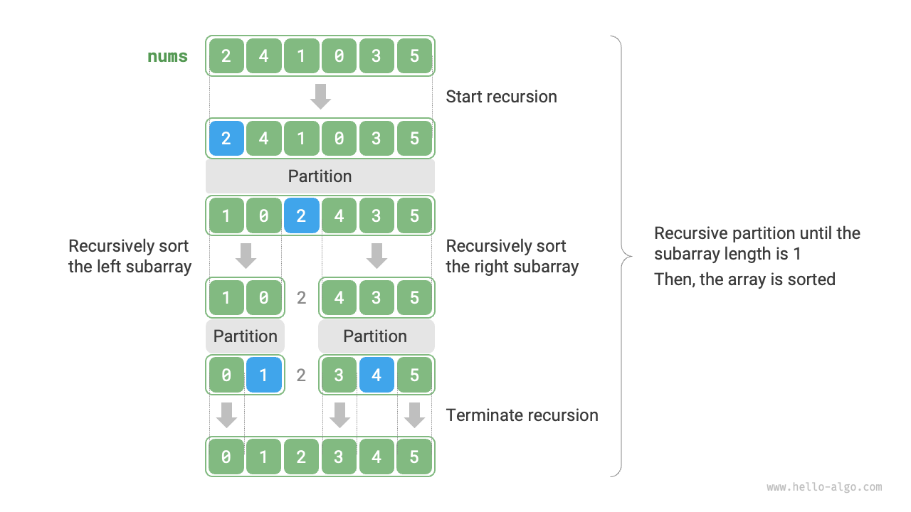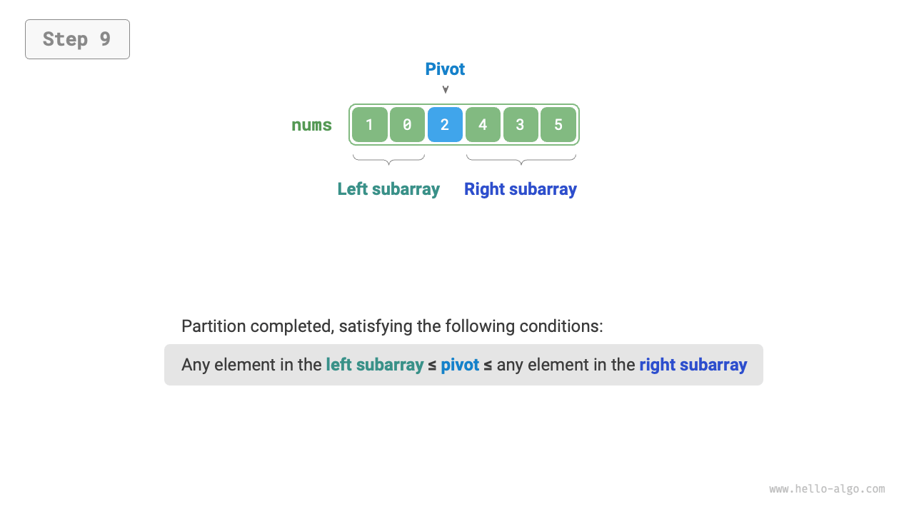 ピボット分割後、元の配列は3つの部分に分割されます:左サブ配列、ピボット、右サブ配列で、「左サブ配列の任意の要素 \(\leq\) ピボット \(\leq\) 右サブ配列の任意の要素」を満たします。したがって、これら2つのサブ配列のみをソートすればよいのです。