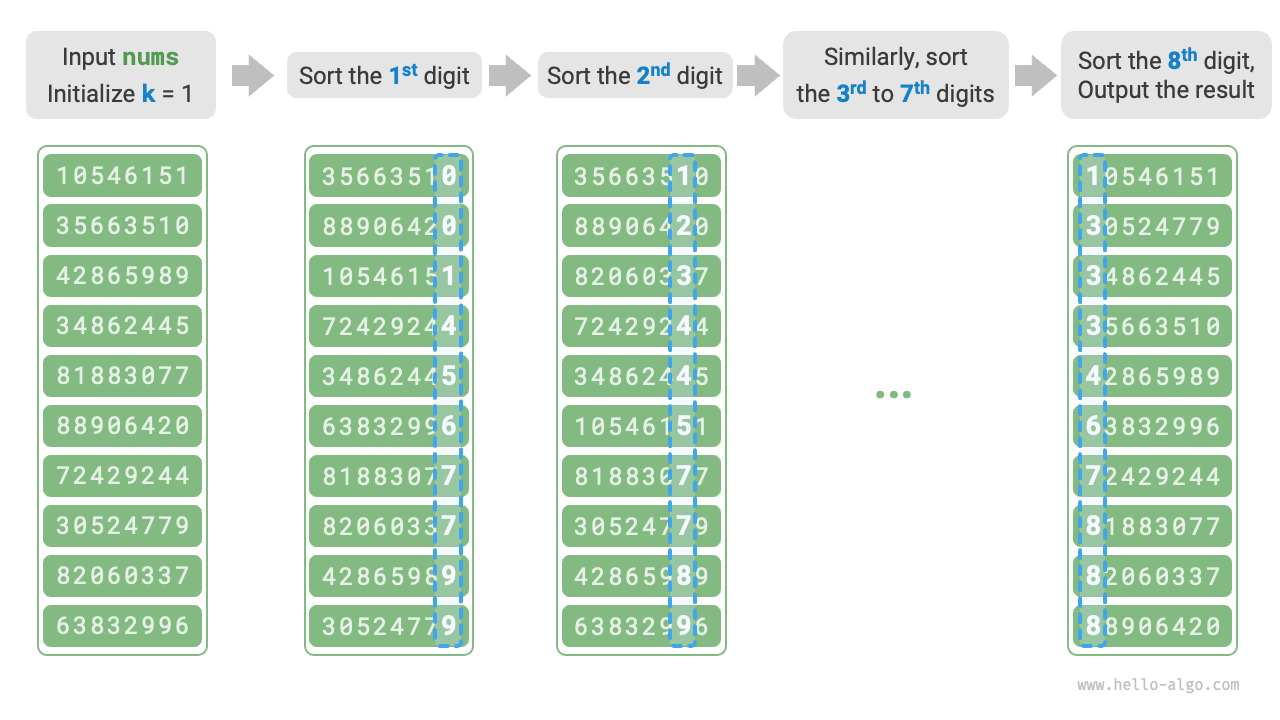 連続するソートラウンドでは、後のラウンドの結果が前のラウンドの結果を上書きします。例えば、最初のラウンドの結果が \(a < b\) で、2番目のラウンドが \(a > b\) の場合、2番目のラウンドの結果が最初のラウンドの結果を置き換えます。上位桁は下位桁より優先されるため、上位桁の前に下位桁をソートすることが理にかなっています。
