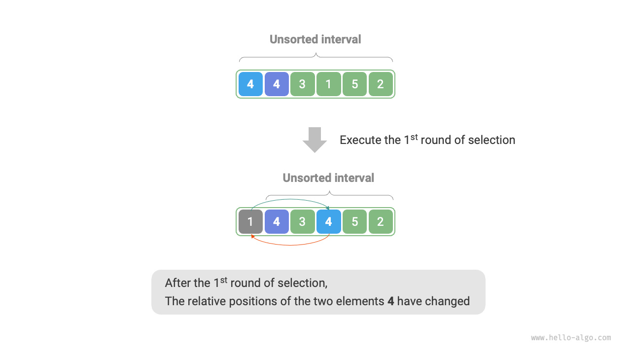 nums[i]は等しい要素の右側に交換される可能性があり、相対順序が変わる原因となります。