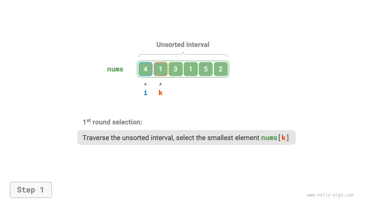 - 区間\([1, n-1]\)の最小要素を選択し、インデックス\(1\)の要素と交換します。この後、配列の最初の2つの要素がソートされます。