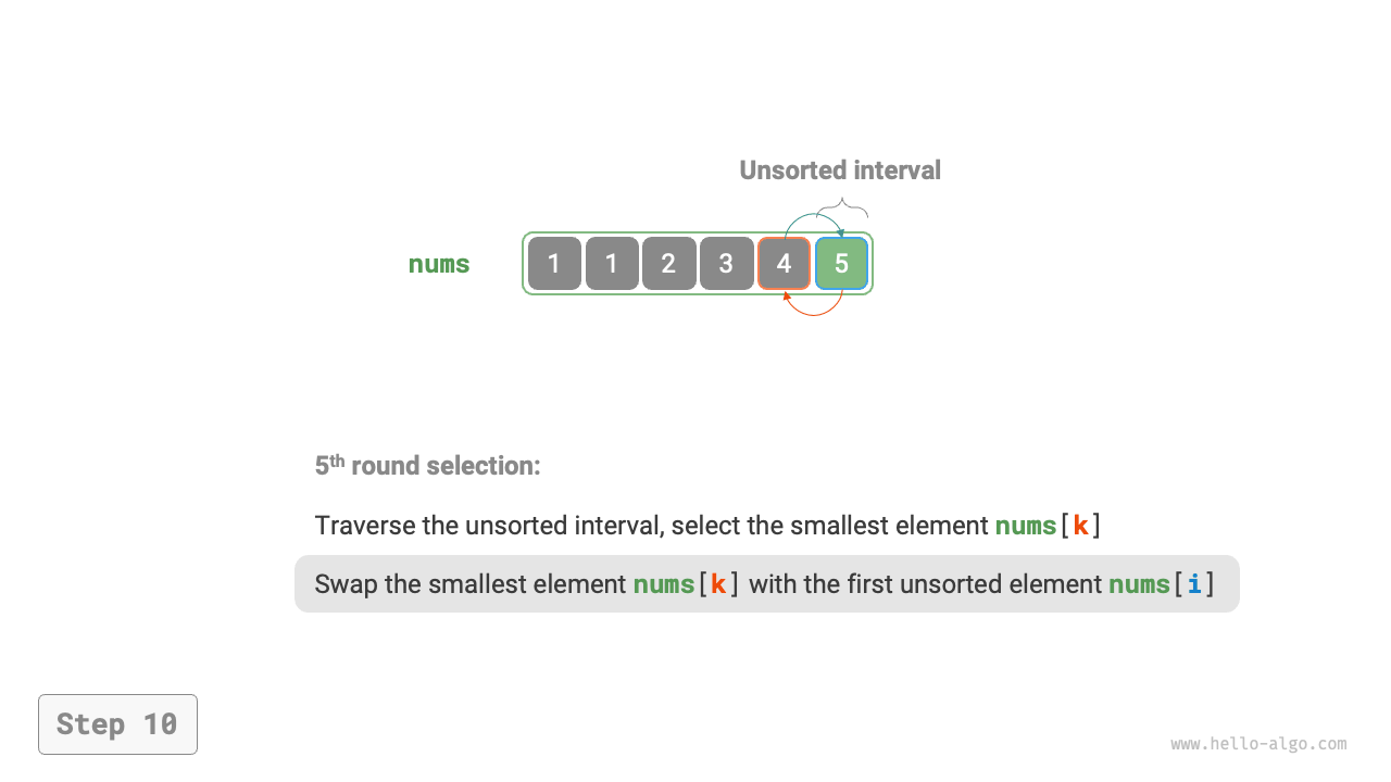- この方法で続行します。\(n - 1\)ラウンドの選択と交換の後、最初の\(n - 1\)個の要素がソートされます。